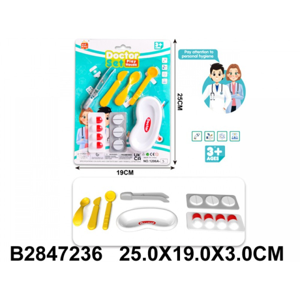 материал: пластмасса; в наборе 7 предметов: лоток для инструментов, пинцет, ложечка, смотровое зеркало, скальпель, блистер с таблетка - 2 шт.; упаковка: блистер