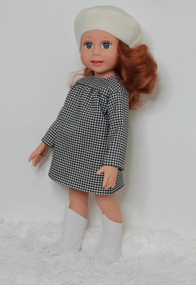 Яна – милая, очаровательная кукла-девочка,с большими выразительными глазками. Глаза у куклы вставные не закрывающиеся, с пушистыми ресничками. Волосы куклы очень похожи на натуральные, прошиты по всему контуру головы, их можно расчесывать и укладывать в различные прически. Руки и ноги куклы могут вращаться . Кукла может стоять и сидеть на горизонтальной поверхности. В наряд куклы входят: платье, берет, обувь.