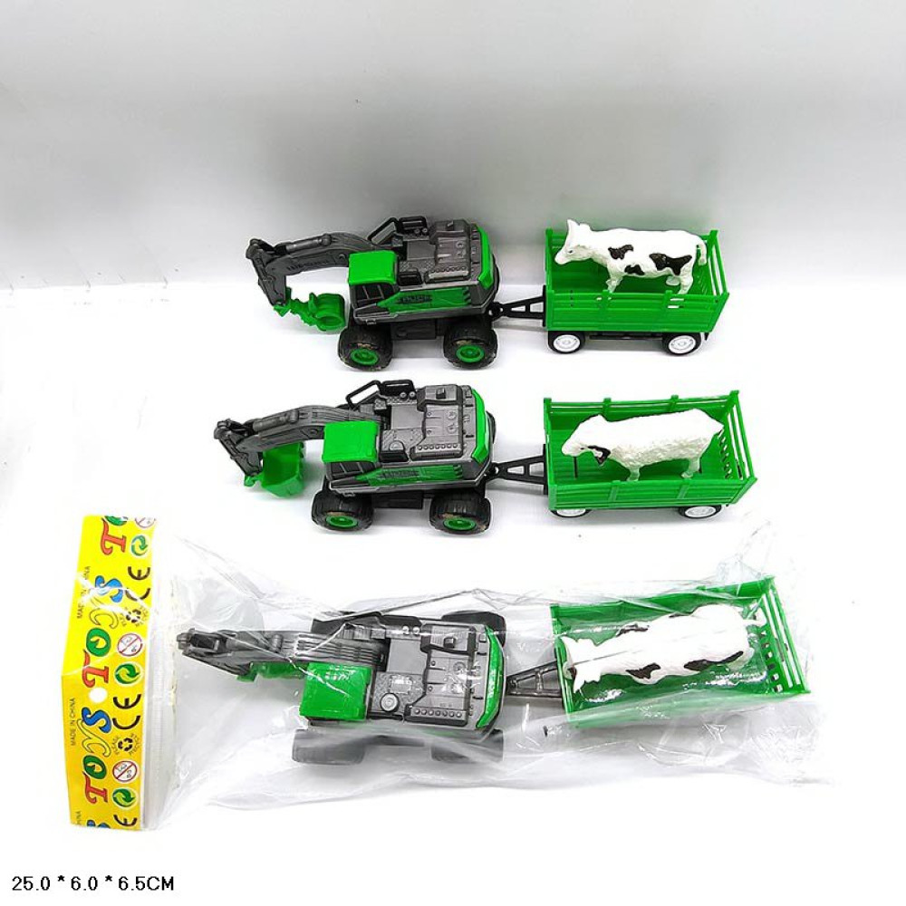 материал: пластмасса; компл.: спецтехника с инерционным механизмом (8.0 х 5.5 х 6.0 см) - 1 шт., прицеп с брёвнами (длина прицепа = 9.5 см) - 1 шт.; длина трактора и прицепа в сцепке: 22.5 см