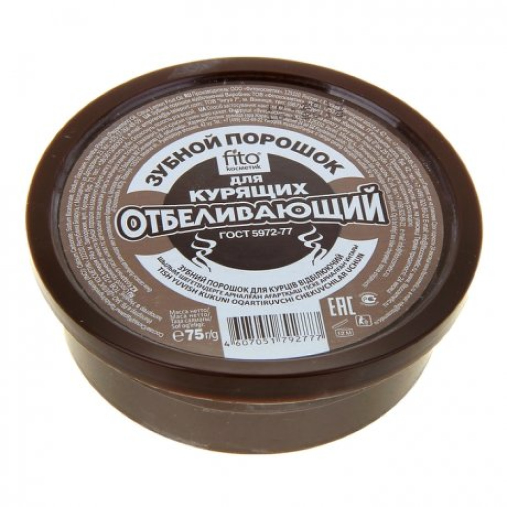 Зубной порошок «Отбеливающий» для курящих — гигиеническое средство, обеспечивающее быстрое и эффективное отбеливание зубов за счёт абразивного удаления табачного налёта. Специализированный зубной порошок не только эффективно снимает налёт, но и освежает полость рта, защищает зубы от кариеса, предотвращает появление зубного камня.
