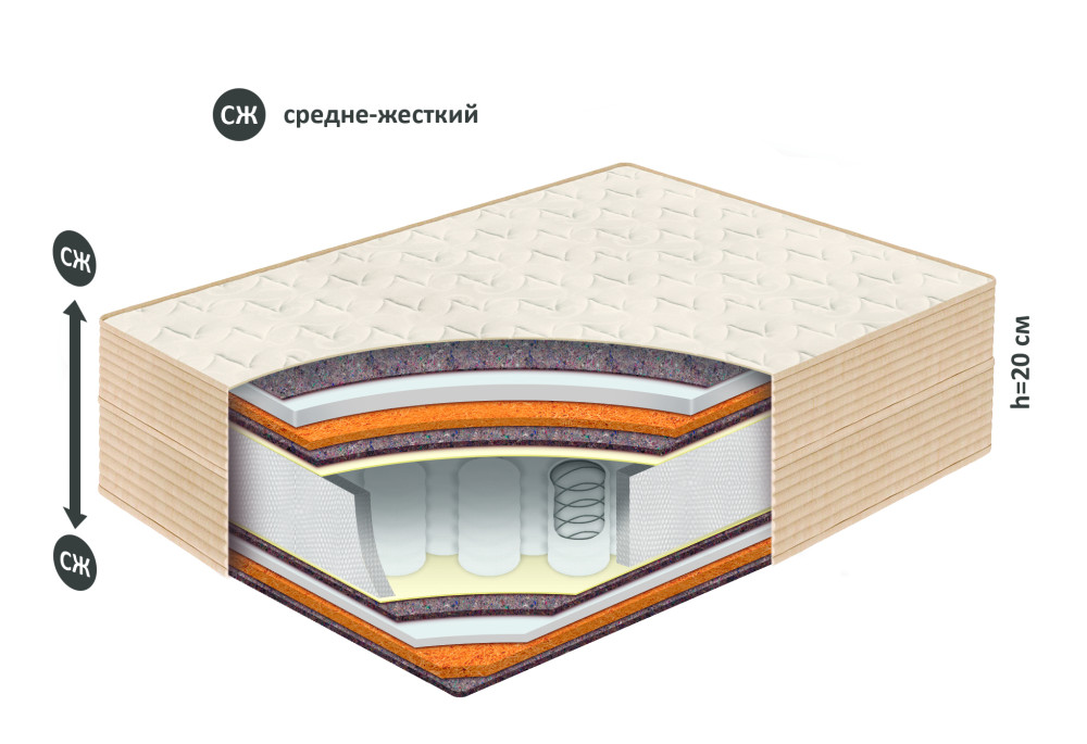 Состав: Стеганный съемный чехол на молнии, Полотно нетканое, Высокоэластичная пена, Кокосовая койра, Полотно нетканое, Спанбонд, Блок независимых пружин - 14 см, Спанбонд, Полотно нетканое, Высокоэластичная пена, Кокосовая койра, Полотно нетканое, ППУ окантовка пружинного блока по периметру