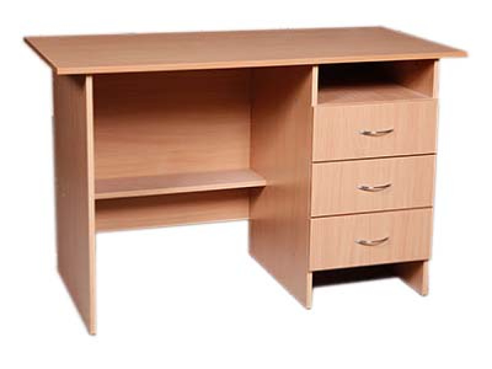 Стол письменный с постоянными параметрами, со столешницей прямоугольной формы, с вертикальной передней стенкой, со стационарной тумбой с тремя наружным выдвижными ящиками на роликовых направляющих и нишей в подстолье над ящиками, со щитовыми проходными боковинами. Так же стол снабжён горизонтальной полкой.