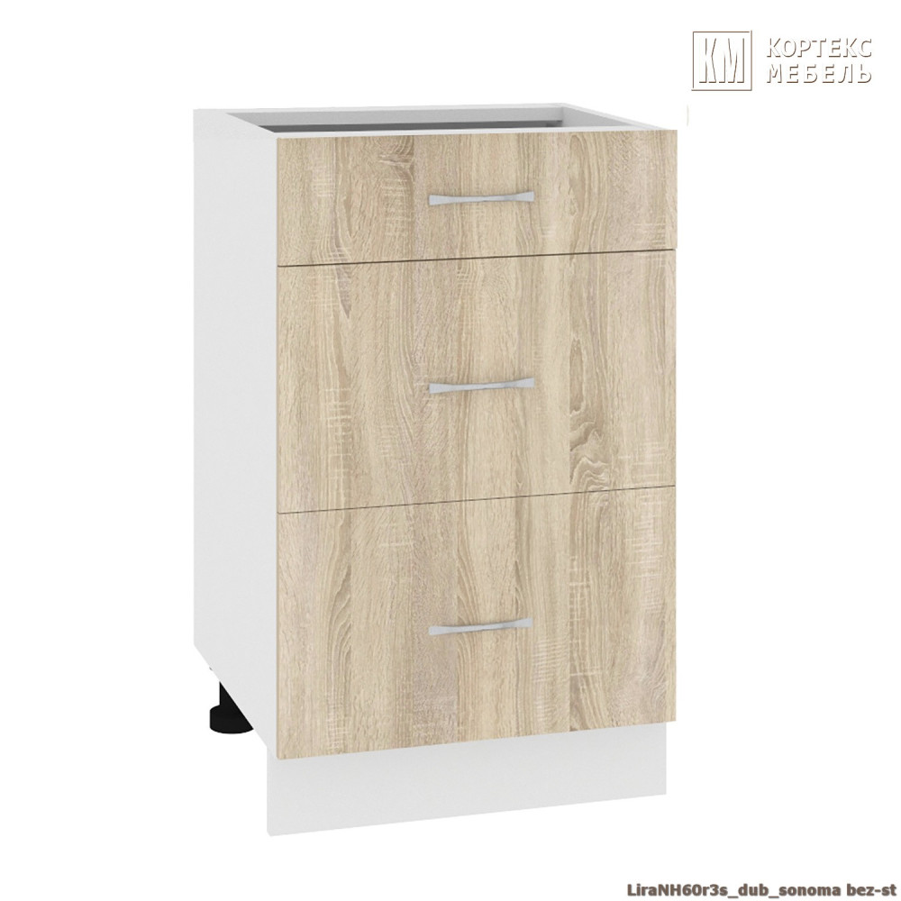 Нижний шкаф НШ60р3ш Без Столешницы, шириной 60 см., укомплектован 3-мя вместительными выдвижными ящиками, удобными для хранения столовых приборов, кухонных полотенец и прочих предметов, необходимых на кухне.
