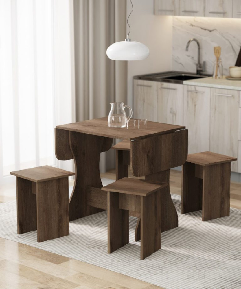 Корпус и столешница стола и стульев изготавливаются из распространенного и недорогого материала – ламинированного ДСП 16мм. Материал обладает повышенной устойчивостью к царапинам и повреждения. Края обработаны, под цвет корпуса. Скругленная форма боковин стола освобождает больше пространства вокруг стола. И вероятность что вы или ваши дети ударятся, намного ниже. Стол раздвигается двух сторон.