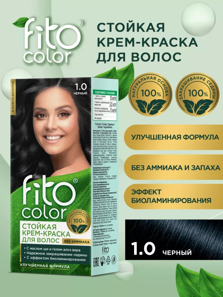 Стойкая безаммиачная крем-краска Fito color от Фитокосметик (Fito Косметик) — инновационный прорыв в сфере окрашивания волос! Безупречная формула без запаха не содержит аммиак и имеет 100% натуральную основу, которая дарит локонам стойкий насыщенный цвет и обладает эффектом bio-ламинирования. Нежная кремовая текстура, обволакивая каждый волос, глубоко проникает в его структуру и окрашивает в сочный объемный цвет. Идеально прокрашивает длину и отросшие седые корни! Входящие в состав гель алоэ вера, масла крапивы, ши и экстракт шалфея интенсивно ухаживают за прядями в процессе окрашивания: питают и восстанавливают, придают гладкость, эластичность и блеск. Тон Черный 1.0 создан для ярких брюнеток, решивших усилить глубину темного оттенка брюнет. В комплект перманентной краски Фито Колор входит бальзам кондиционер, который великолепно завершает процедуру: закрепляет пигмент, увлажняет и укрепляет, делает пряди гладкими и шелковистыми. Результат: стойкость оттенка и закрашивание седины надолго, роскошные густые волосы, как после салонного ламинирования!