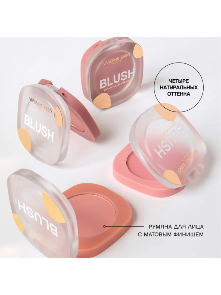 MACARON — румяна от VIVIENNE SABÓ в четырех оттенках с матовым финишем. Это сочетание нежности, легкости и натуральности. Румяна, вдохновленные пирожными макарон, словно маленькие капельки счастья на коже, — нежные и сладкие. Четыре натуральных оттенка с матовым финишем искрятся игрой света, придавая лицу изысканную свежесть и чарующую мягкость. Пудровая шелковистая текстура идеально растушевывается и создает на коже легкий натуральный румянец. Матовая упаковка MACARON в цвет румян с золотыми деталями напоминает французские пирожные макарон. Румяна доступны в четырех оттенках: 01 персиковом, 02 холодно-розовом, 03 нежно-розовом, 04 натурально-розовом. Позволь им оживить твой образ и добавить в него сладкое волшебство. В макияже с MACARON от VIVIENNE SABÓ ты выглядишь, как самое вкусное угощение, готовое растопить сердца вокруг. MACARON — румяна от VIVIENNE SABÓ в четырех оттенках с матовым финишем. Это сочетание нежности, легкости и натуральности. Наноси на щеки пушистой объемной кистью легкими круговыми движениями. Для трендового образа также можешь нанести румяна на скулы и растушевать к вискам. Для эффекта как после загара нанеси румяна в центр лица и на переносицу.