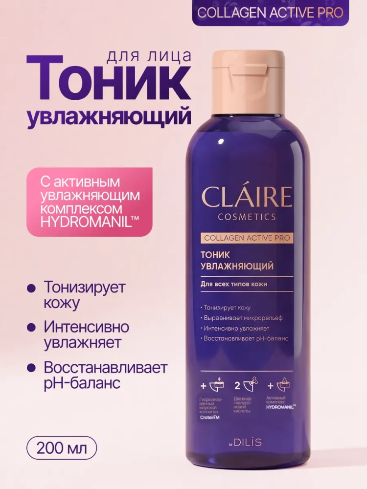 Увлажняющий тоник серии Collagen Active от белорусского бренда уходовой косметики Клэр отлично подготавливает кожу лица к дальнейшему уходу. Тонизирующее средство на основе морского коллагена и биоактивного комплекса NanoVit с первых секунд освежает кожу лица. Активные компоненты тонера с гиалуроновой кислотой двух видов увлажняют кожу на разных уровнях, улучшают ее микрорельеф и устраняют чувство стянутости. Комплекс активных компонентов восстанавливает защитный барьер кожи, выравнивает тон и помогает избавиться от прыщей, черных точек, акне и других несовершенств. Гиалуроновая кислота обеспечивает глубокое увлажнение кожи и антивозрастной лифтинг эффект, что позволяет предотвратить образование морщин и против возрастных пигментных пятен. Восстанавливает гидролипидный баланс и защищает от внешних воздействий. Походит для всех видов кожи, включая сухую, чувствительную, проблемную, комбинированную и жирную. Очищающий лосьон восстанавливает эластичность и упругость кожи. Обеспечивает максимально увлажняющий эффект, придавая лицу красоту, молодость и сияние. Это универсальное средство, которое улучшит состояние кожи любого типа, поможет нормализовать работу сальных желез, способствует сужению пор и одновременно сохранить молодость и упругость. Активные компоненты в составе обеспечивают интенсивное увлажнение, поэтому тоник отлично подготавливает кожу к дальнейшим уходовым процедурам. Применение: смочите тоником ватный диск и протрите предварительно очищенную кожу лица и шеи, избегая области вокруг глаз. Используйте утром и вечером после снятия макияжа и умывания.