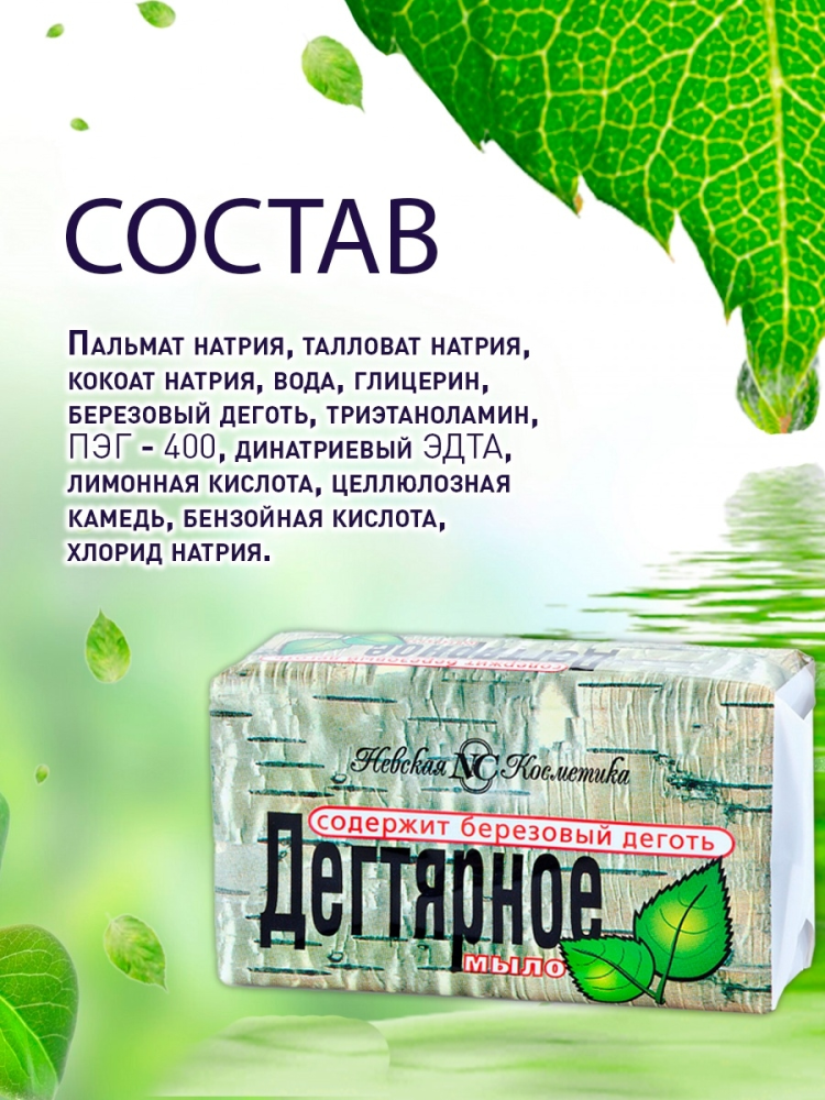 Мыло Дегтярное от Невской Косметики для очищения лица, тела и рук, 140 гр. Дегтярное мыло идеально для ухода за кожей, склонной к жирности и высыпаниям. Натуральный деготь в составе туалетного мыла является природным антисептиком, противовоспалительным, противозудным средством. Дегтярное мыло, улучшает обменные процессы кожи, помогает справиться с кожными заболеваниями. Дегтярное мыло эффективно борется с проблемами эпидермиса, устраняет жирный блеск, избавляет от черных точек. Регулярное использование дегтярного мыла оздоравливает жирную и проблемную кожу, уменьшает воспаления, сужает поры, улучшает кровообращение. Дегтярное банное мыло создает атмосферу настоящей русской бани и березовых веников благодаря аромату натурального берестового дегтя, без применения искусственных ароматизаторов. Твердое мыло подходит для бани, сауны, душа. Натуральное дегтярное косметическое мыло сочетает в себе традиционный уход, высокое качество и заботу о здоровье вашей кожи.