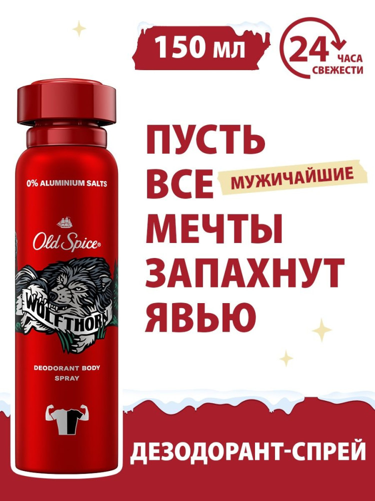 Сила мужичайшего аромата дезодоранта-спрея Old Spice (Олд Спайс) Wolfthorn с нотами цитрусов и удачной охоты раскроет самые хищные стороны твоей натуры. С ним железобетонная стойкость аромата на весь день тебе обеспечена, как и свежесть на 24 часа. Дезодорант-спрей Wolfthorn объемом 150 мл – это одни сплошные достоинства: мощная формула без алюминия, которая может справиться с лавиной неприятного запаха и не оставляет пятен на одежде, а еще яркий аромат с терпкими тропическими нотками, который точно не оставит равнодушным никого в радиусе пары метров от тебя.