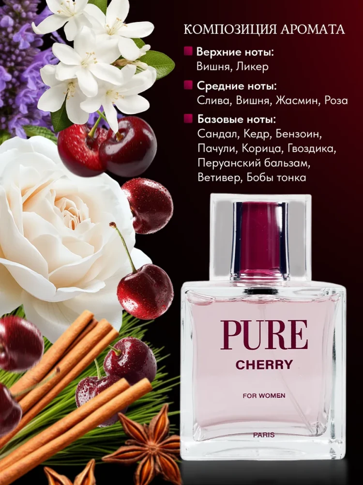 Парфюмерная вода Pure Cherry от GEPARLYS PARFUMS PARIS — это изысканный цветочный аромат, который подчеркнет вашу женственность и индивидуальность. Сладкие ноты вишни в сочетании с нежными цветочными аккордами создают утонченный и соблазнительный шлейф. Этот аромат станет идеальным дополнением к любому образу, будь то романтический ужин или прогулка по городу. Pure Cherry — это прекрасный выбор для тех, кто ценит элегантность и неповторимый стиль. Группа ароматов: Цветочные, Восточные Верхние ноты: Вишня: Ликер Средние ноты: Слива: Вишня, Жасмин, Роза Базовые ноты: Сандал, Кедр, Бензоин, Пачули, Корица, Гвоздика, Перуанский бальзам, Ветивер, Бобы тонка