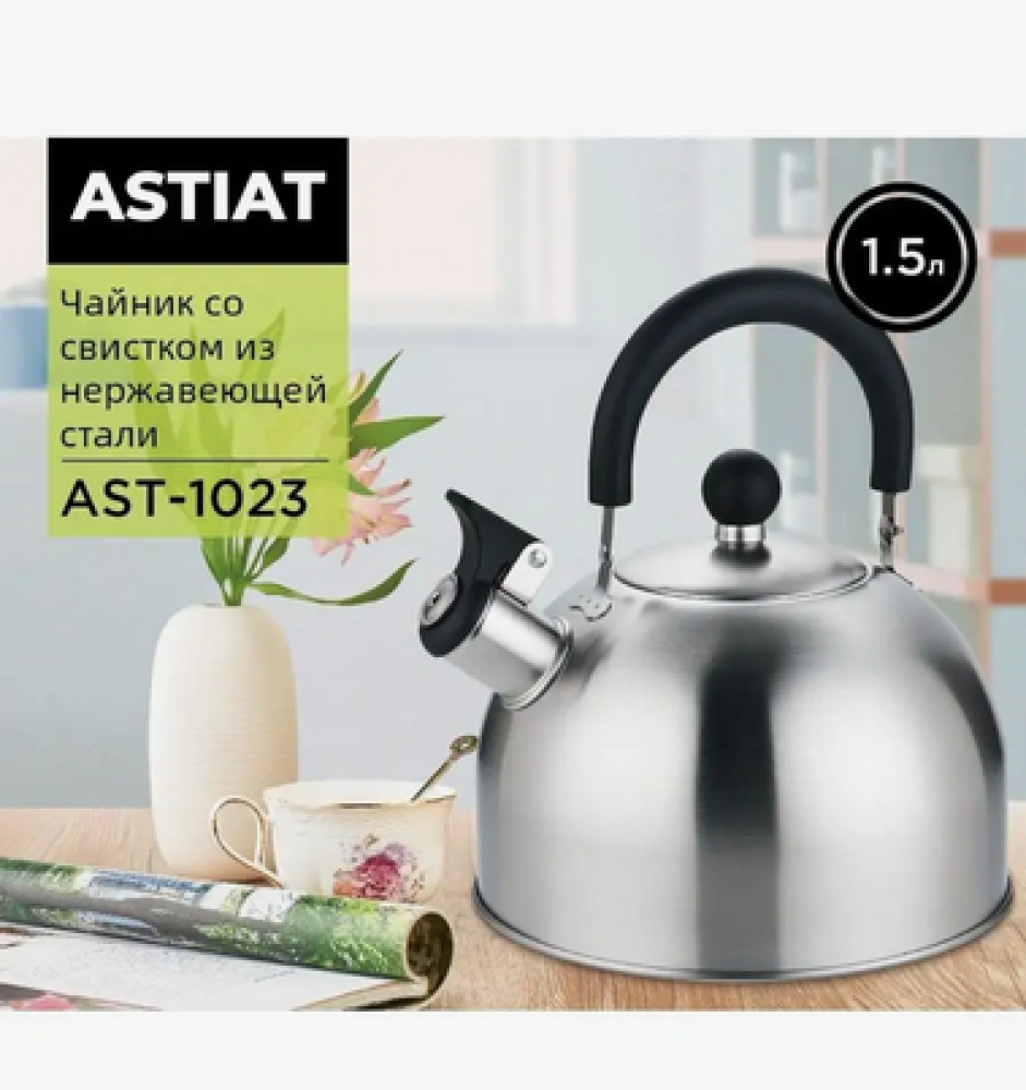 Чайник AST-1023 со свистком 1.5 л из нержавеющей стали подойдет для индукционной, газовой, электрической и стеклокерамической плиты. Полный (сухой) объем чайника- 1.5 л. Полезный (с водой) объем- 1 л. Это универсальный предмет для любой кухни. Свисток на носике легко и безопасно открывается с помощью установленного рычага, а так же не позволит пропустить момент закипания воды, и вы вовремя снимите чайник с плиты. Можно спокойно заниматься своими делами и не забыть о том, что чайник закипел. Свисток фиксируется в открытом состоянии. Складывающаяся черная бакелитовая ручка. Материал: нержавеющая сталь. Матовый.