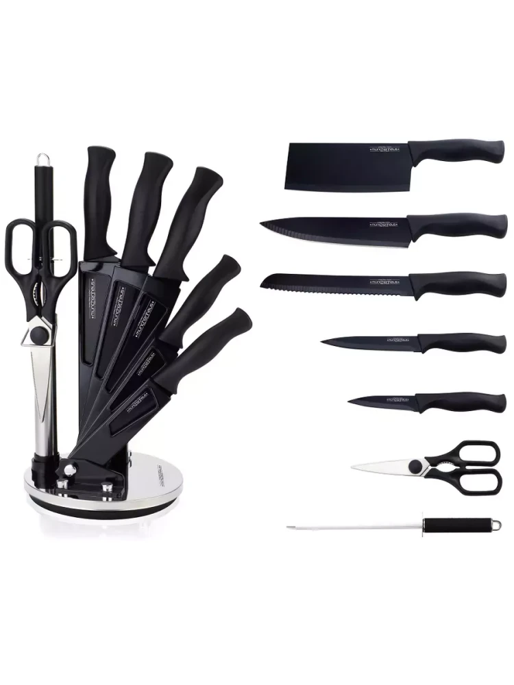Кухонный топорик длиной 16,5 см идеально подходит для рубки мяса и костей, обеспечивая легкость в работе даже с самыми жесткими продуктами. Поварской нож длиной 20 см станет незаменимым инструментом при нарезке крупных кусков мяса и овощей, а его острая кромка гарантирует аккуратные и точные срезы. Нож для хлеба также длиной 20 см с зубчатым лезвием позволяет легко нарезать свежий хлеб, не оставляя крошек, а универсальный нож длиной 12,7 см прекрасно справляется с различными кулинарными задачами, от нарезки фруктов до резки сыра. Овощной нож длиной 9 см предназначен для быстрой и удобной нарезки овощей, что делает его отличным помощником для салатов и гарниров. В дополнение к ножам в набор входят кухонные ножницы, которые пригодятся для множества повседневных задач — от нарезки зелени до открытия упаковок. Мусат длиной 19 см поможет поддерживать остроту лезвий, обеспечивая долговечность и надежность каждого инструмента. Удобная вращающаяся подставка не только экономит место на вашей кухне, но и позволяет легко находить нужный нож в любой момент. Стильный дизайн подставки подчеркнет вашу кухонную эстетику и сделает процесс приготовления пищи более приятным.