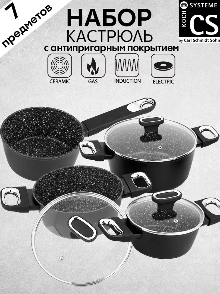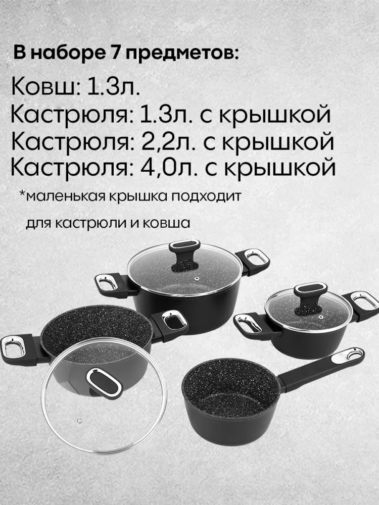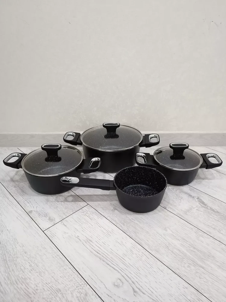 В комплект входит 4 кастрюли различных размеров, что делает его универсальным выбором для любых кулинарных задач. Так же в комплекте 3 крышки разного размера. Маленькая крышка подходит на кастрюлю 1.3л. и ковш 1.3. литра. Кастрюли обладают термостойкой эмалью, что обеспечивает долговечность и устойчивость к царапинам. Толщина дна составляет 6 мм, что гарантирует равномерное нагревание и сохранение тепла. Набор подходит для использования на газовых, электрических и индукционных плитах, делая его универсальным выбором для современных кухонь. Внешний вид кастрюль выдержан в стиле минимализма, что позволяет им гармонично вписаться в любой интерьер. Антипригарное покрытие не только упрощает процесс приготовления пищи, но и облегчает уборку, поскольку пища не пригорает к поверхности кастрюли.