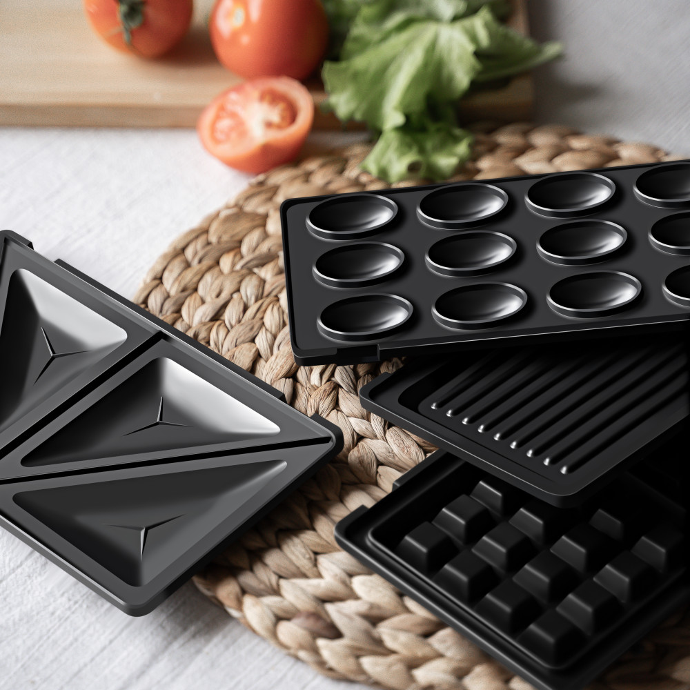 4 пары съемных панелей: венские вафли, гриль, сэндвичи, орешки. Антипригарное покрытие форм.
