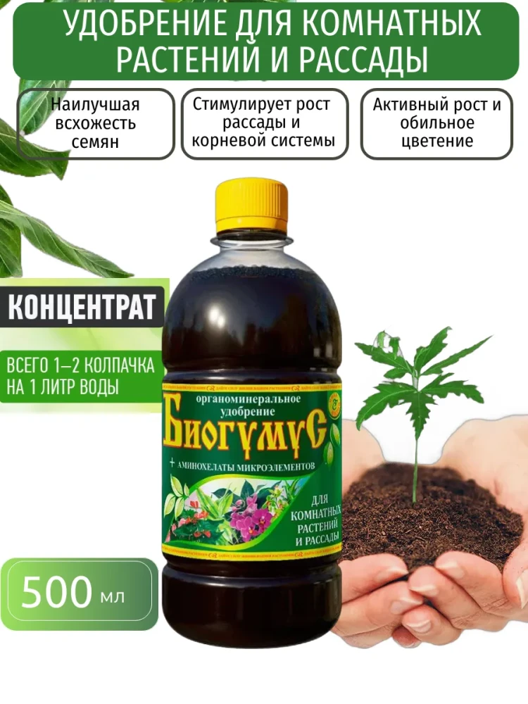 Биогумус концентрат это универсаное удобрение для комнатных растений и рассады стимулирует рост рассады и развитие мощной корневой системы, влияет на быстрый рост растений и их пышность, повышает иммунитет и сопротивляемость к заболеваниям, способствует быстрому восстановлению и приживаемости растений после пересадки, обеспечивает активный рост и обильное цветение декоративных растений. Биогумус жидкий органический универсальный для растений активное органоминеральное удобрение. Удобрение для рассады содержит в себе все легко усваиваемые питательные вещества. Стимулятор роста для цветов и рассады интенсифицирует фотосинтез. обеспечивает растениям длительный запас питательных веществ;- смягчает стресс рассады при пересадке в почву;- интенсифицирует обменные процессы в растительной клетке;- способствует развитию всех почвенных микроорганизмов, что содействует интенсивному образованию гумуса в почве;- обеспечивает наилучшую всхожесть семян, насыщая их питательными веществами.