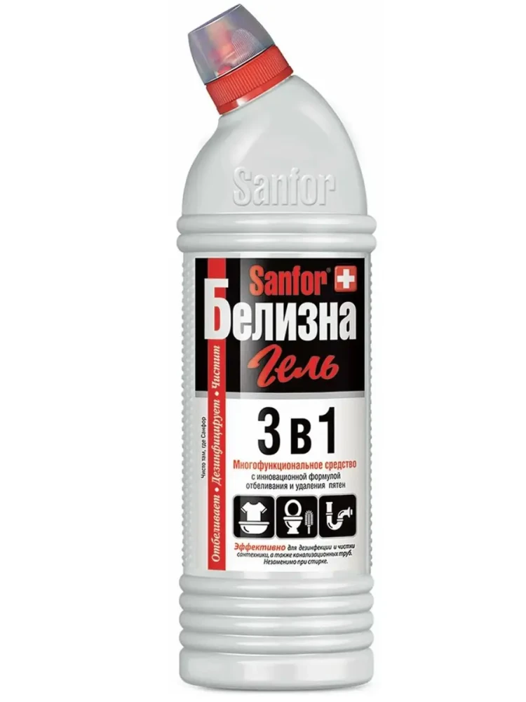 Многофункциональное средство комплексного действия (с хлором) с инновационной формулой отбеливания пятен предназначено для отбеливания и удаления пятен при стирке, а также дезинфекции и чистки сантехники и труб. Sanfor "Белизна гель" 3 в 1 легко справляется со сложными пятнами, желтизной и загрязнениями, уничтожает микробы и бактерии. Благодаря густой консистенции гель равномерно распределяется, не стекает, экономично расходуется. Флакон оснащен антискользящей поверхностью, его удобно удерживать в руке во время уборки, а также блокиратором крышки для защиты от детей. Sanfor "Белизна гель" 3 в 1 гарантирует чистоту, белизну и свежесть во всем доме.